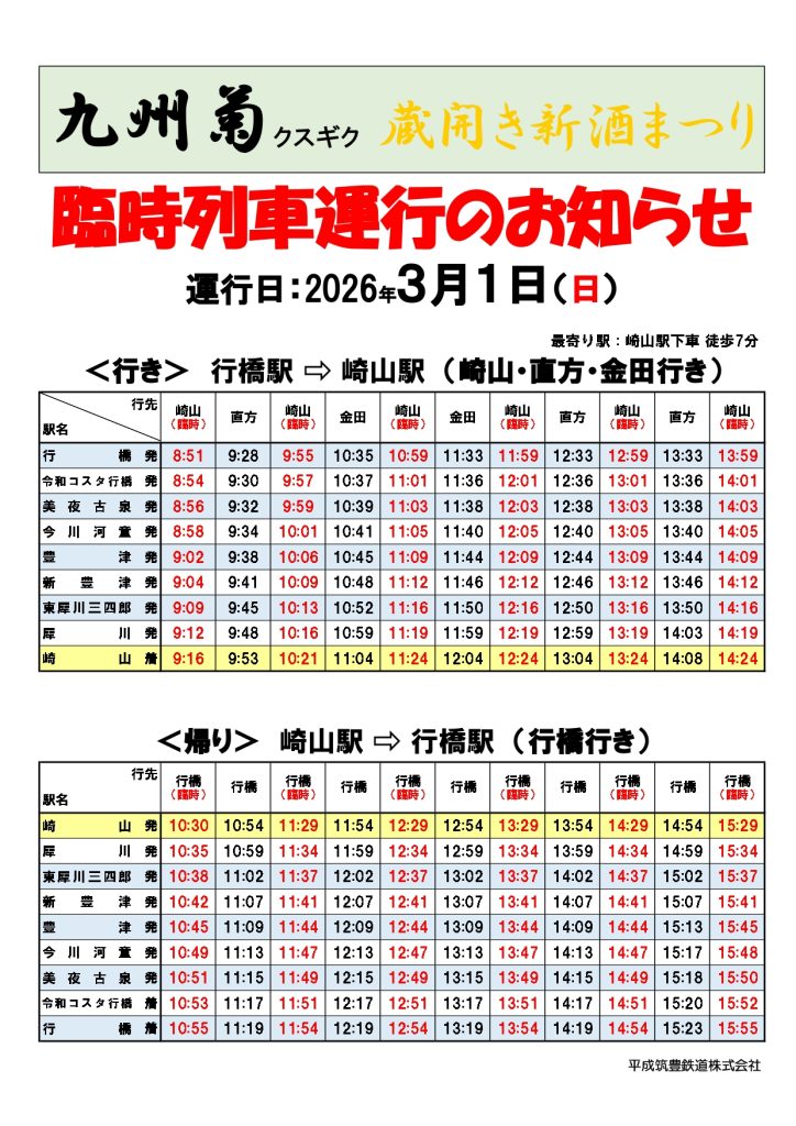 ぜひ平成筑豊鉄道をご利用のうえ、新酒をお楽しみ下さい。